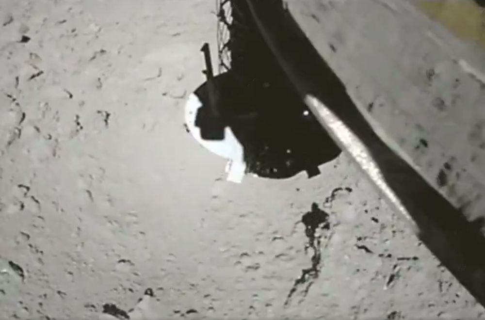 The video shows Hayabusa 2 lowering itself and its sampling horn into the crater it blasted in the surface of Ryugu with its impactor. This is the second sample gathered by Hayabusa 2. The first sample was a surface sample collected back in February 2019. This second one was collected on July 11th, 2019, and is the first sub-surface sample from an asteroid.