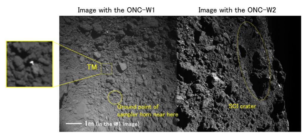 JAXA released some other images from the second sampling operation, too. This first image is a composite taken with Hayabusa 2's Optical Navigation Cameras (ONC W1 and ONC W2.)