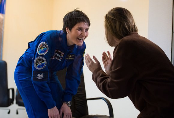 Prior to the launch of Expedition 42 in November 2014, Samantha Cristoforetti (left, European Space Agency) speaks with a loved one through the glass at a pre-launch press conference. Credit: NASA/Aubrey Gemignani[/caption]