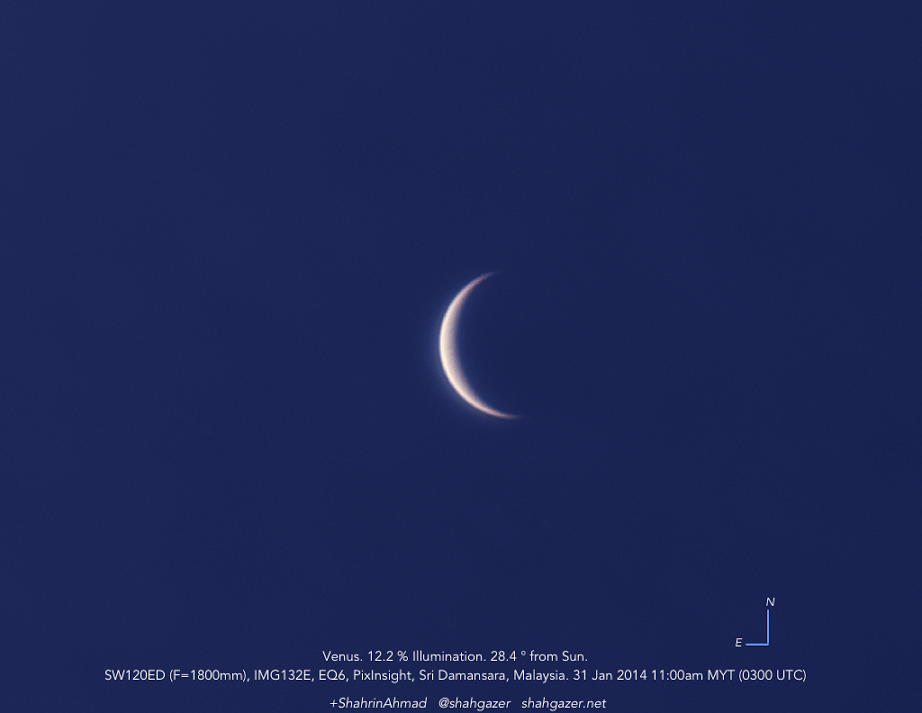 . This combination occurs because although the crescent of Venus is fattening, the apparent size of the disk is shrinking as the planet pulls away from us in its speedy interior orbit. Can you spy the elusive "ashen light of Venus" through a telescope? Long a controversy, this has been reported by observers as a dim "glow" on the nighttime hemisphere of Venus.