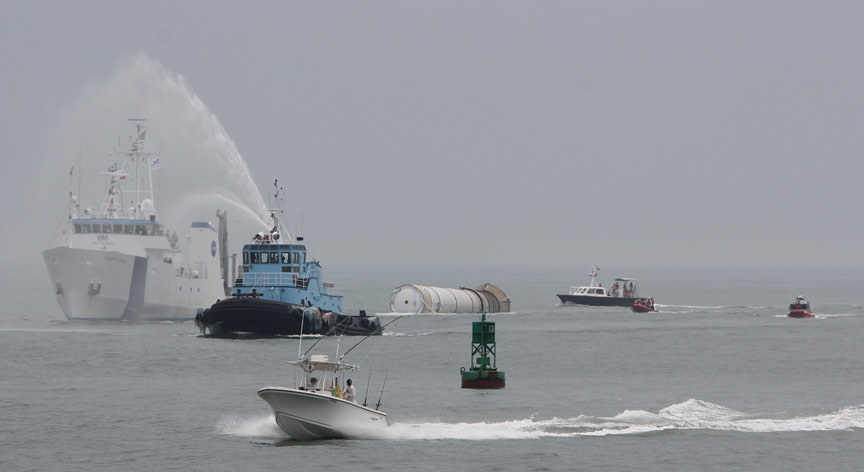 A large crowd of onlookers - including many of us KSC press site photojournalists - were on hand to witness the water cannon blasting from the Elizabeth's tug, owned by the Port Canaveral Port Authority, and trumpeting the procession through the port channel and eventually past several gigantic Cruise ships.
