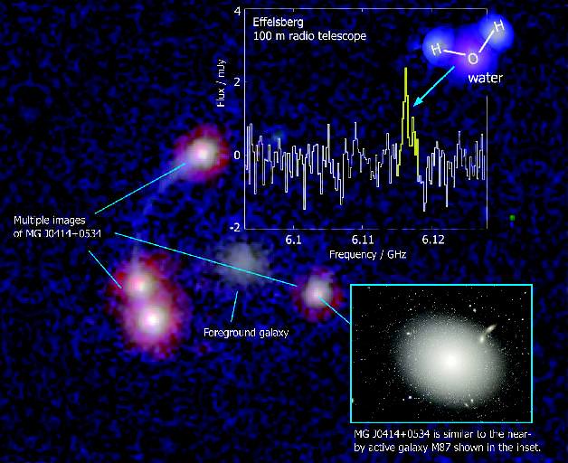[/caption] The astronomers first detected the water signal with the Effelsberg telescope. They then turned to the VLA's sharper imaging capability to confirm that it was indeed coming from the distant galaxy. The gravitational lens produces not one, but four images of MG J0414+0534 as seen from Earth. Using the VLA, the scientists found the specific frequency attributable to the water masers in the two brightest of the four lensed images.