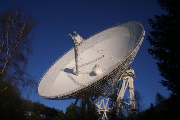 With the help of gravitational lensing from another galaxy, nearly 8 billion light-years away, located directly in the line of sight from MG J0414+0534 to Earth, the foreground galaxy's gravity served as a lens to further brighten the more-distant galaxy and make the emission from the water molecules visible to the radio telescopes. [caption id="attachment_22444" align="aligncenter" width="580" caption="Effelsberg Telescope."]