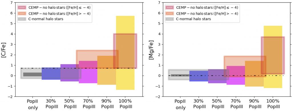Carbon is formed in stars as part of the CNO cycle, which is the second-level fusion cycle after hydrogen burning. Magnesium is a product of a 3-stage fusion of carbon with helium. Many first-generation stars exploded as high-powered supernovae, but some exploded with lower energy. These low-energy supernovae would cast off elements such as carbon and magnesium, but not much iron. So, stars with an exceptionally high [C/Fe] ratio likely formed from the remnant material of a single first-generation star. The lower the [C/Fe] ratio, the more likely a population II star formed from first and second-generation stars.