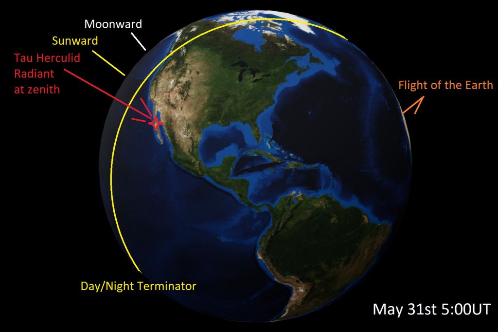 The key date and time to watch for a possible 2022 Herculid outburst is on the morning of Tuesday, May 31stat around 5:00 Universal Time or 1:00 AM Eastern Time EDT. This places the radiant high in the sky for Northern Hemisphere observers in the pre-dawn hours, another plus. The Moon is also well out of the way, reaching New just the day prior on May 30th.