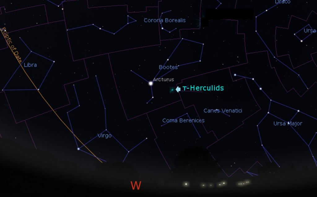 Fast-forward to 2022, and models show that things could get interesting later this month. Comet 73P lays down a stream known as the Tau Herculid meteors. The shower takes its name from its 1930 radiant position near the +3.9 magnitude star Tau Herculis, though in modern times, the radiant has drifted into the adjacent constellation of Boötes the Herdsman.