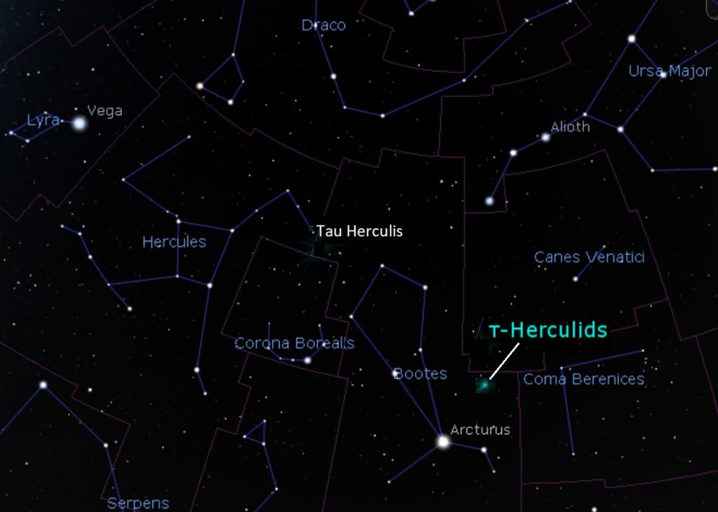 The Tau Herculids are a 'slow shower' with an inbound velocity of 16 km/second—slow that is, compared to, say the November Leonids, with a swift 72 km/second incoming velocity. Expect any Tau Herculids you see to be slow and stately emanating from a radiant near the globular cluster Messier 3, about a third the way between the bright star Arcturus and the end of the handle of the Big Dipper asterism.