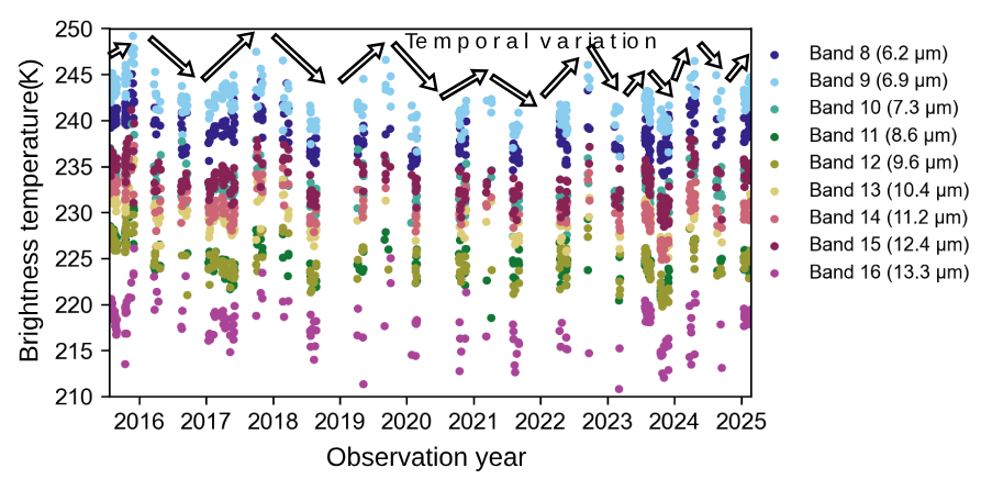 *The Advanced Himawari Imagers measure Venus' temperature over multiple infrared bands, showing the temporal variation across the period of observation. ©2025 Nishiyama et al. CC-BY-ND*