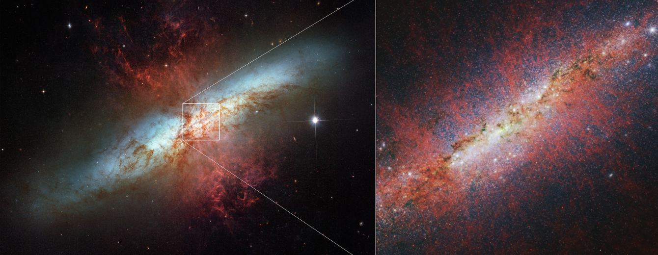 Another key detail captured in the images is the "galactic wind" rushing out from the core, which was visible at longer infrared wavelengths. This wind is caused by the rapid rate of star formation and subsequent supernovae and has a significant influence on the surrounding environment. Studying this wind was a major objective of the project (GO 1701), which aimed to investigate how these winds interact with cold and hot material. By a central region of M82, the team was able to examine where the wind originates and the impact it has on surrounding material.