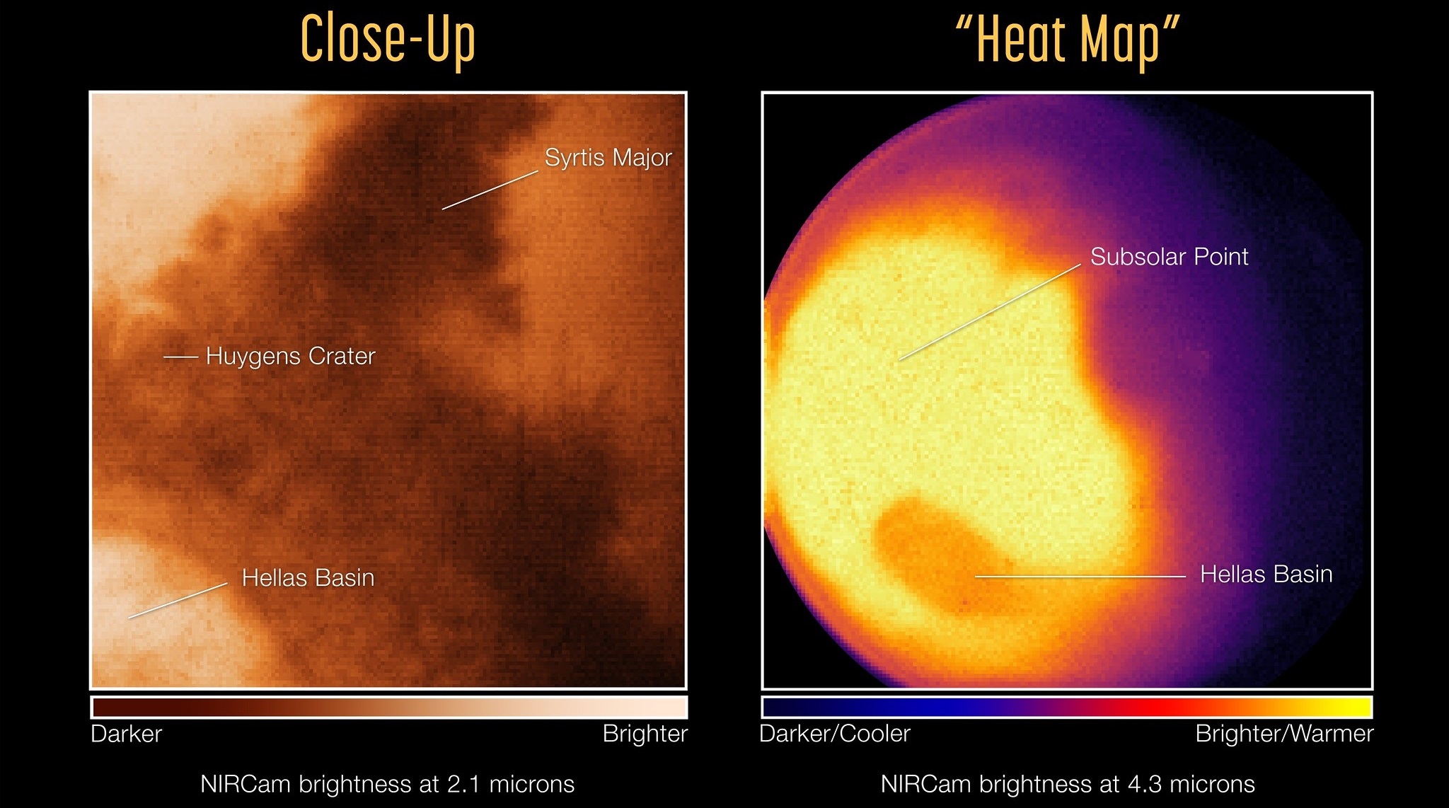 These observations were part of Webb's Cycle 1 Guaranteed Time Observation (GTO) Solar System program, led by Heidi Hammel - the Vice President for Science with the Association of Universities for Research in Astronomy (AURA). The images were taken by Webb 's Near-Infrared Camera (NIRCam) and Mid-Infrared Instrument (MIRI) of Mars' observable disk (the sunlit-facing side) and show a region of the planet's eastern hemisphere in these two wavelengths. The telescope was positioned nearly 1.5 million km (932,000 mi) at the Sun-Earth L2 Lagrange Point, where it will remain for its entire mission.