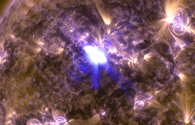 NASA's Solar Dynamics Observatory captured this image of an M6.5 class flare at 3:16 am EDT on April 11, 2013. This image shows a combination of light in wavelengths of 131 and 171 Angstroms. Credit: NASA/SDO.[/caption]
