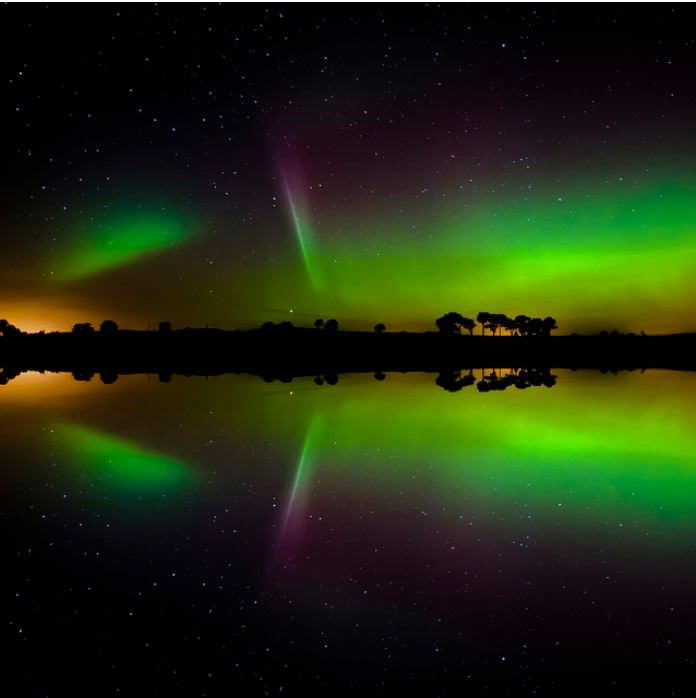 The Northern Lights over Kilmany, Scotland reflect in a body of water. Credit: