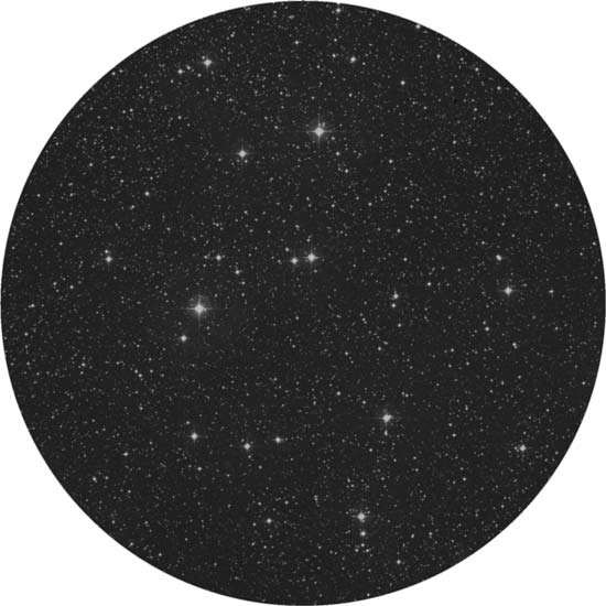 Enjoy its red stars! Discovered by Al Sufi in 964 AD, this 3.5 magnitude collection of stars was again recorded by Hodierna. Thanks to its extended size of more than 60' it escaped the catalogs of both Messier and Herschel. Only around a half dozen stars share the same proper motion, which may make it a cluster much like the Pleiades, but studies suggest it is merely an asterism—but one with two binary stars at its heart.