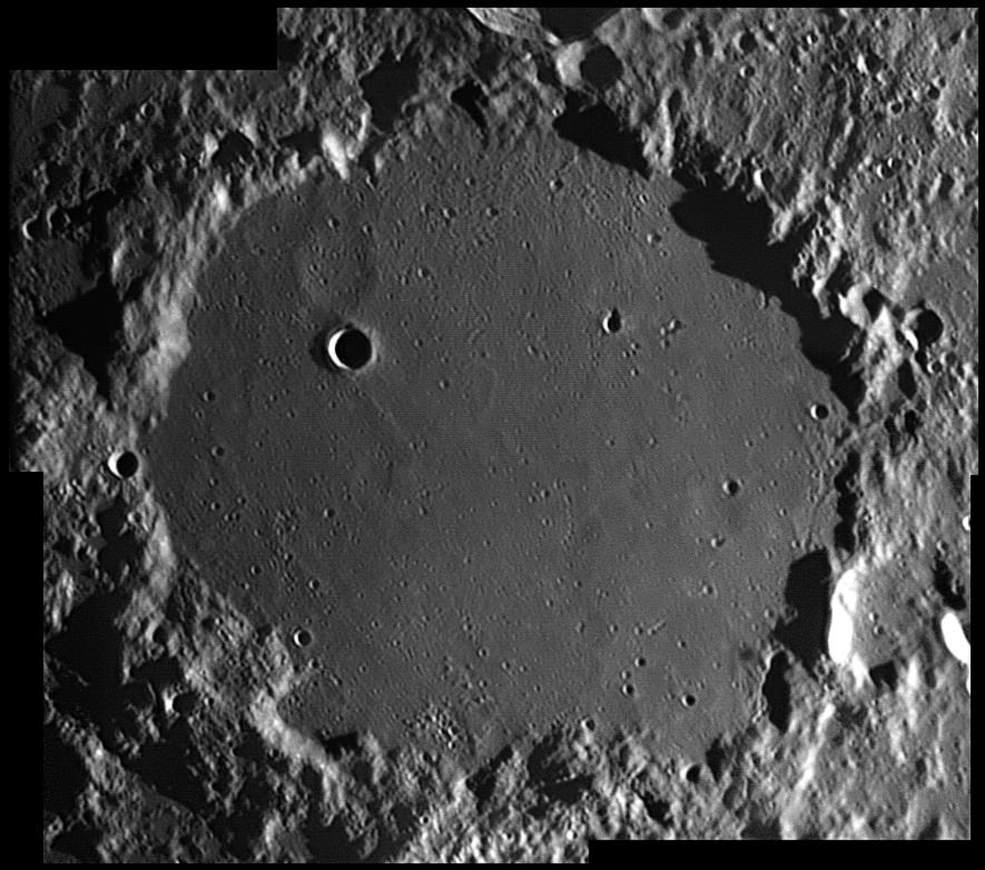 – Tonight the waxing Moon's most notable features will be the vast area of craters dominating the south-central portion near and along the terminator. Now emerging is Ptolemaeus – just north-northeast of Albategnius. This large round crater is a mountain walled plain filled with lava flow. With the exception of interior crater Ptolemaeus A, binoculars will see it as very smooth. Telescopes, however, can reveal faint mottling in the surface of the crater's interior, along with a single elongated craterlet to the northeast. Despite its apparent uniformity, close inspection has revealed as many as 195 interior craterlets within Ptolemaeus! Look for a variety of interior ridges and shallow depressions.