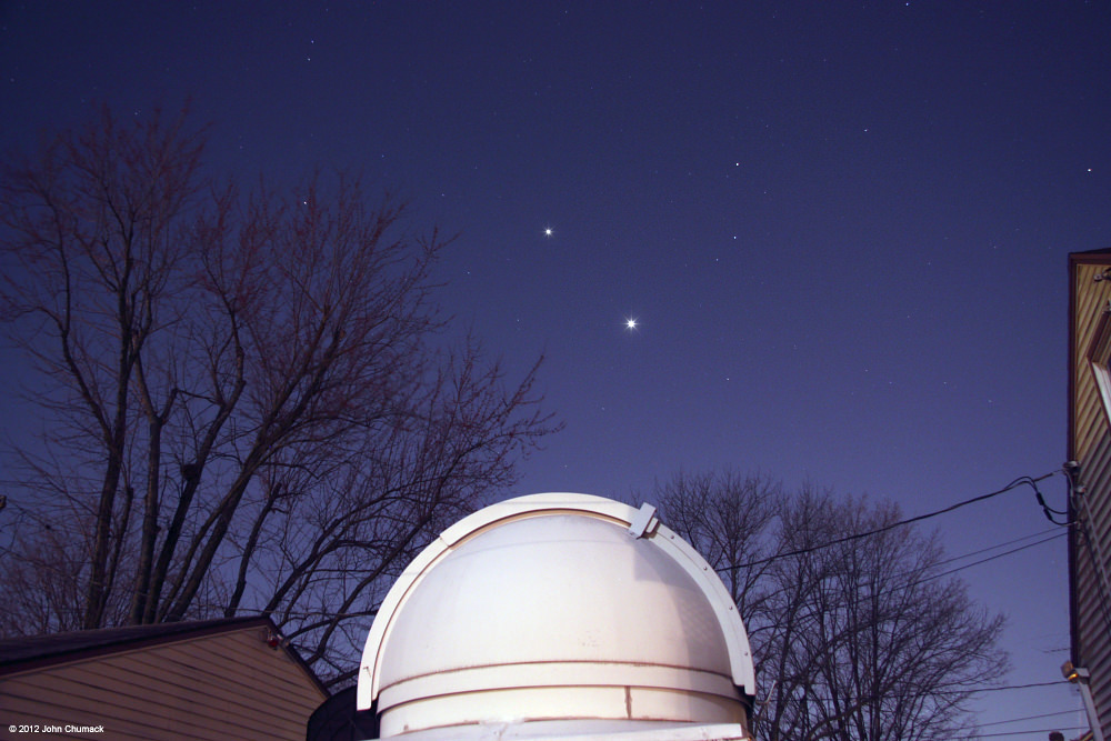 - No. That's not the "headlights" of a UFO on the western horizon tonight… It's a very cool pairing of Venus and Jupiter! It's not often you see the two visually brightest planets making a close visual pass at each other and tonight you'll spot the inner planet to the south and the outer planet to the north. This would make a great photo opportunity! Why not consider adding something interesting to your picture like a scenic building, tree, or even a person? Watch in the days ahead as Jupiter appears to stay in the same spot at the same time, yet Venus will climb higher.