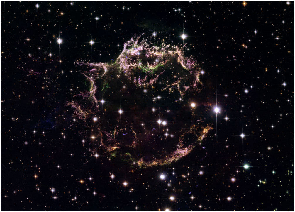 Tonight is New Moon! Let's see what's up there in the region of Cas A using visible light. The nearest bright star to Cas A is Beta Cassiopeiae – the bright star westward of the "W." To locate the region of Cas A, go about three finger-widths due west of Beta and follow the subtle curve of three 5th magnitude stars. Cas A lies less than one degree south-southwest of the second star in the sequence of three. This star is a complex 5th magnitude multiple star system associated with variable star AR Cas.