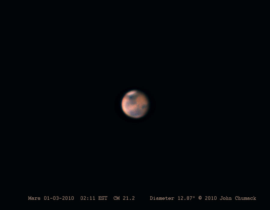 Although John claims "poor seeing", using a camera helps to even the odds and his image reveals some outstanding details such as the North Polar Ice Cap (top), Acidalia Planitia (top center), Terra Meridiana (lower right), and Valles Marineris (lower left). For sharp-eyed observers, you can even spot some bright fluffy clouds forming on the far left limb and a small hint of a Southern Polar Cap, too. "Mars is only 12.87 arc seconds across" says Chumack, "Still small and a bit of a challenge to get details in less than good seeing."