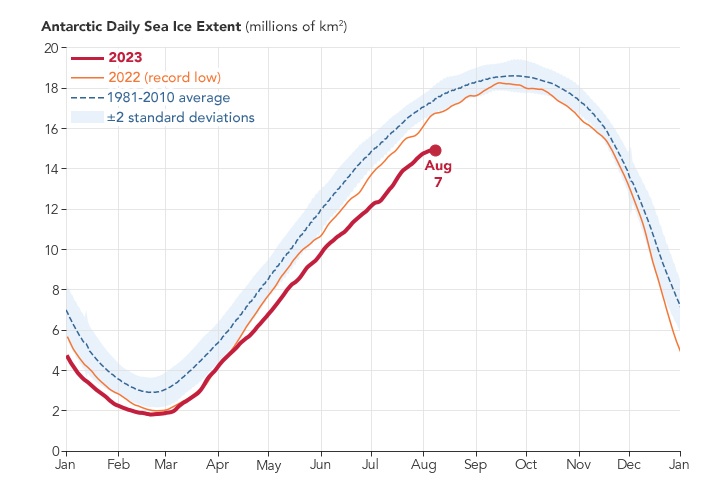 NASA's National Snow and Ice Data Center (NSIDC) satellite measurements show that through July of this year, sea ice coverage averaged only 13.5 million kilometers. That's the lowest measurement since the center began measuring ice in 1978. Usually, Antarctic sea ice affects an area of about 15 million square kilometers. It grows and melts with the change of seasons. For winter 2023, the growth rate slowed down drastically, covering two million square kilometers less than the average. And, that's unusual. "What we're seeing this year is uncharted territory in the satellite record," said Walt Meier, a scientist at NSIDC.