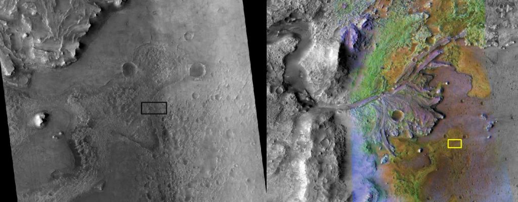 This pair of larger images puts Perseverance and Ingenuity into the context of their mission at Jezero Crater. The ancient delta is clearly visible in the image on the right. The colours in that image are from MRO's CRISM instrument, and they correspond to different minerals present at Jezero Crater.