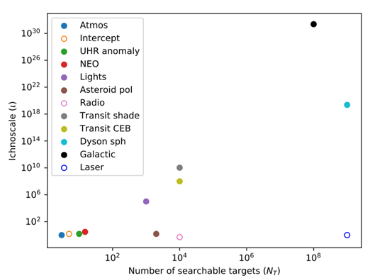 The authors then introduce a graph that helps guide discussions about various technosignatures. On the graph, the y-axis is the ichnoscale, as described above, while the x-axis is the total number of objects that could be observed for that type of technosignature.