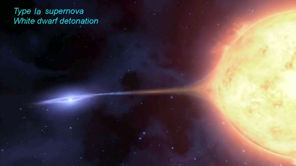 In a Type Ia supernova, a white dwarf (left) draws matter from a companion star until its mass hits a limit which leads to collapse and then explosion. Credit: NASA[/caption] Because of this 1.4 ratio, astronomers use Type Ia supernovae as "standard candles" to measure distances in the Universe. Since they know how much energy it detonated with, astronomers can calculate the distance to the explosion.