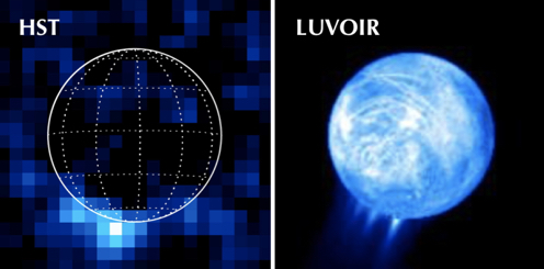 Enceladus seen from Hubble and LUVOIR. Credit: NASA[/caption]