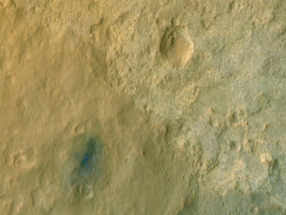 , orbiting approximately 200 km (125 miles) above the surface of Mars. This new image, released today, shows the rover inside Gale Crater surrounded by a skirt of blue-tinted material, including several bright radiating marks --the result of the descent stage rockets clearing layers of dust from the surface.