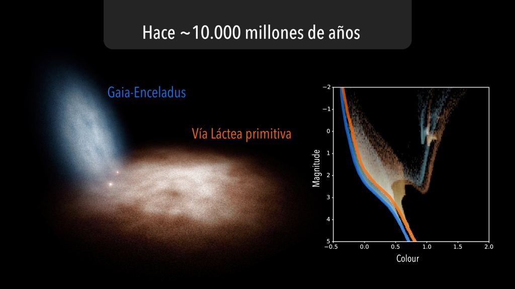 This story starts 13 billion years ago, several hundred million years after the Big Bang, when stars were forming in two separate systems. One was the Gaia-Enceladus dwarf galaxy, and the other was the progenitor of our Milky Way. The early Milky Way was about 4 times more massive than the dwarf galaxy, and was made up of younger, higher metallicity stars.