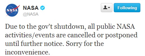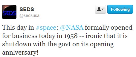 Many observers noted that NASA is marking its 55th anniversary today by shutting down its activities. There's no word yet on when the deadlock in Congress will be resolved. The
