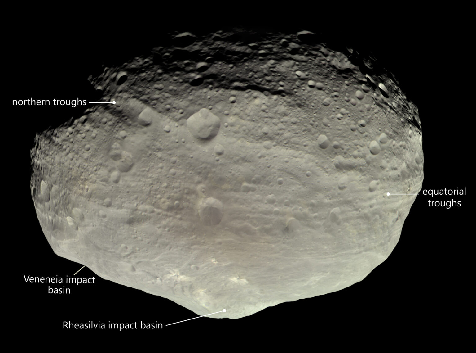 Except things didn't go as awesomely for Vesta as it did for the Earth. For one, the little asteroid was struck by two other large asteroids that managed to leave impact craters so big that they cover almost its entire southern half. By studying Vesta closely, researchers like Klimczak try to understand the evolution of the planetesimal.