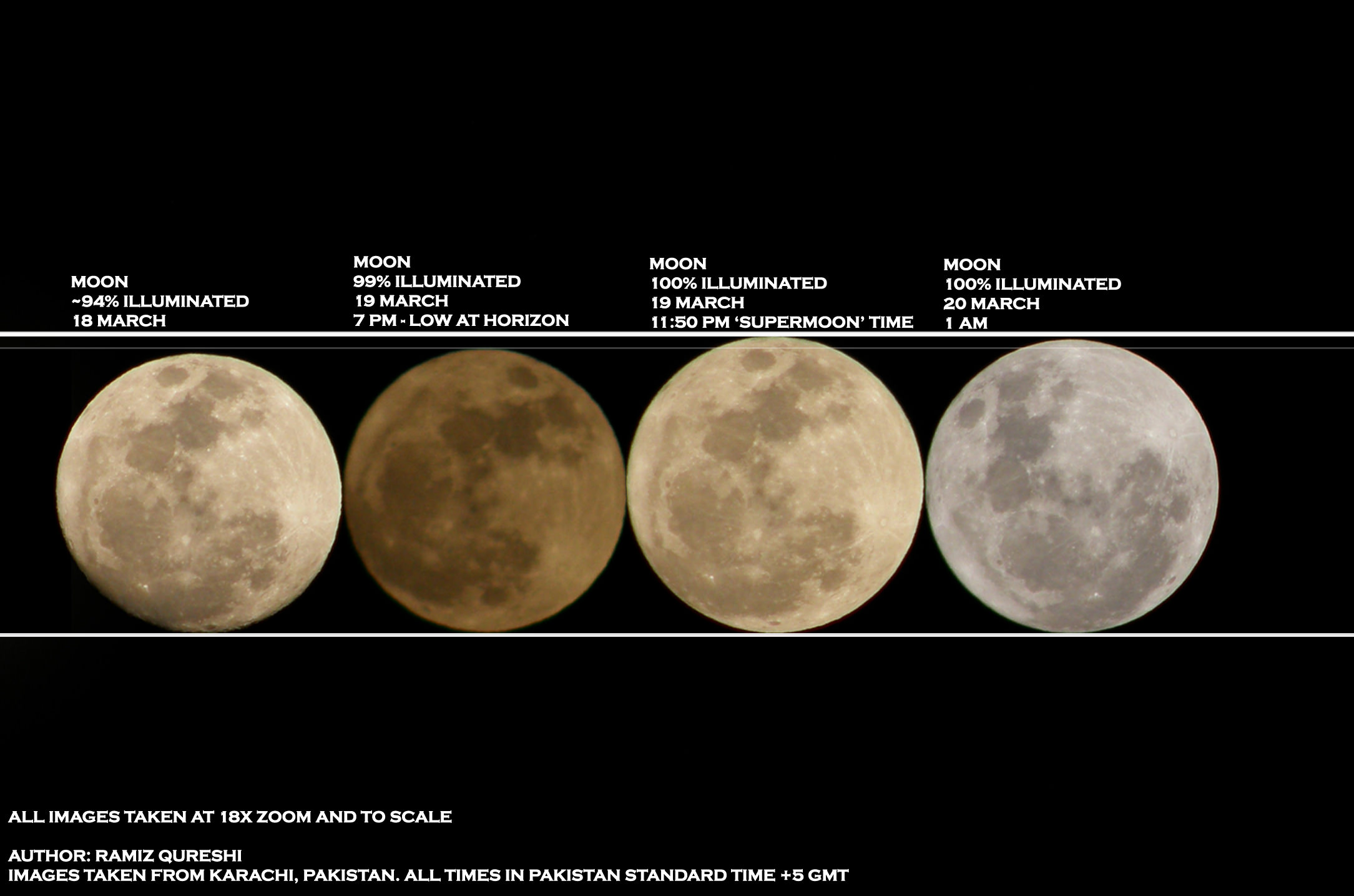 The supermoon of March 19, 2011 (right), compared to an average moon of December 20, 2010 (left). Note the size difference. Image Credit: Marco Langbroek, the Netherlands, via Wikimedia Commons.[/caption]
