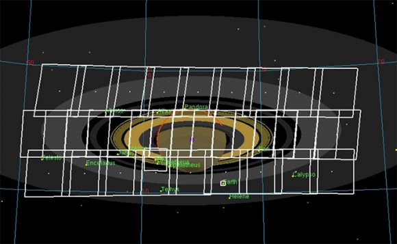 Full mosaic arrangement acquired by Cassini on July 19-20 UTC. Earth was positioned just below the planet. (NASA/JPL-Caltech/SSI)[/caption]