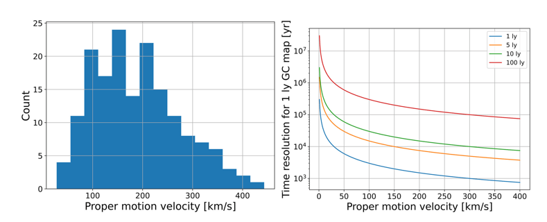 The panel on the left shows the distribution of 164 globular clusters' proper motion velocity. The panel on the right shows the time resolution for the map of the GCs and MSPs. Image Credit: