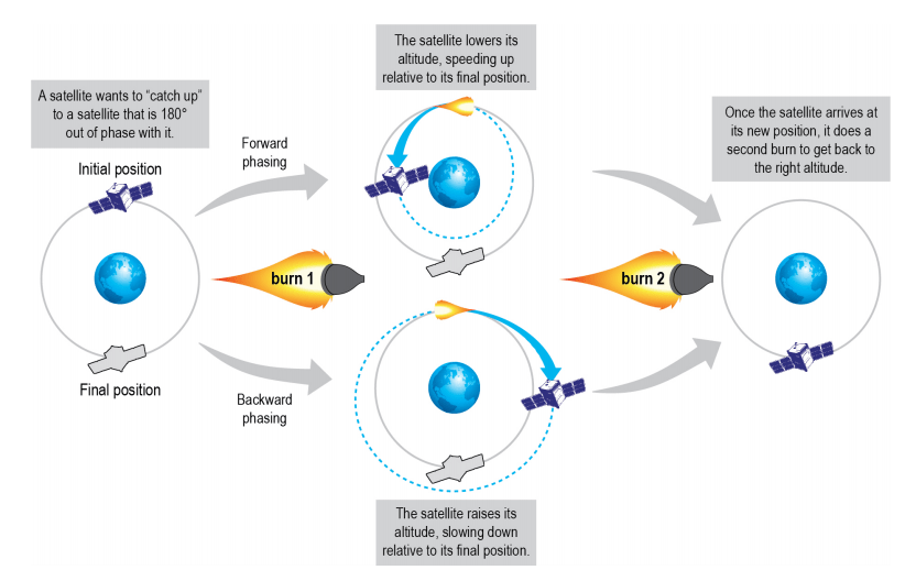 "Getting two satellites to the same altitude and the same plane is straightforward (though time and ?V consuming), but that does not mean they are yet in the same spot. The phasing—current location along the orbital trajectory—of the two satellites must also be the same. Since speed and altitude are connected, getting two satellites in the same spot is not intuitive." Instead, it takes perfect timing and meticulous preparation.