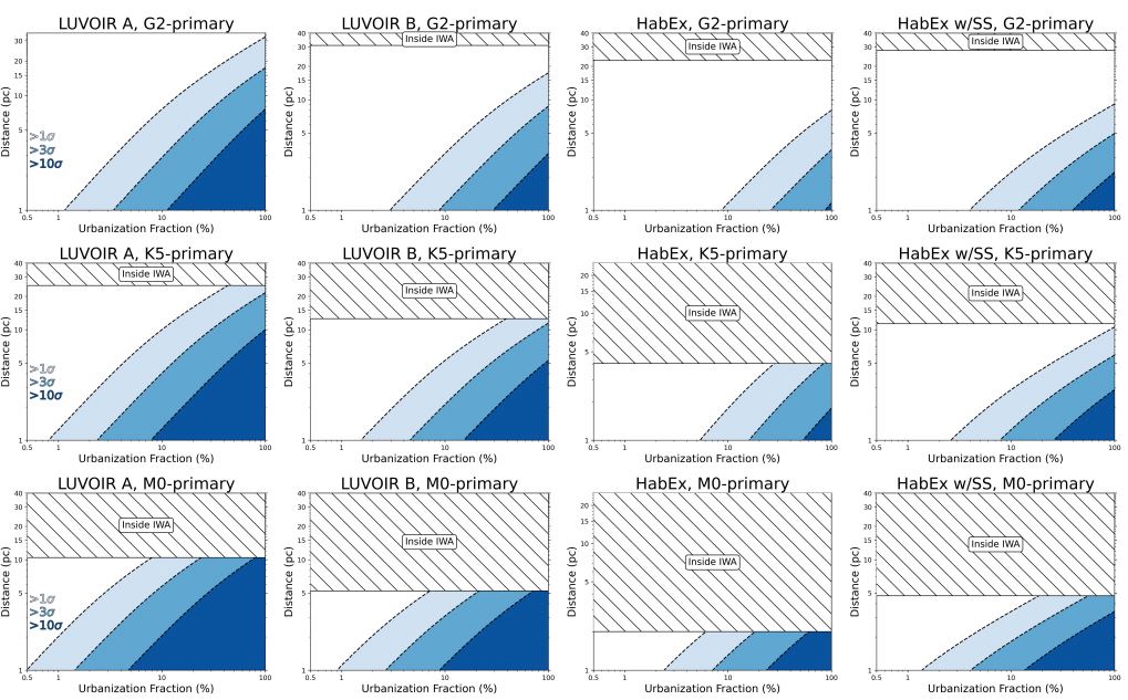 The above figure from Beatty's publication shows the trade offs between the distance from Earth, the level of urbanization, and the class of parent star. The first two variables, level of urbanization and distance from Earth, are self evident. The brighter the artificial lights, the easier they are to see. If the planet resides closer to Earth, its lights are easier to see. But the parent star also plays a role in visibility. Planets orbiting smaller, dimmer stars have better contrast. Their stars are faint enough to not overwhelm artificial illumination and so lower levels of urbanization can be seen on planets in M red dwarf star systems. The figure's blue colour shade indicates the certainty of detection. 1 sigma (the Greek letter that's denoted in the figure) is about 67% certainty. 3 sigma is closer to 99%. 10 sigma is virtually 100%.