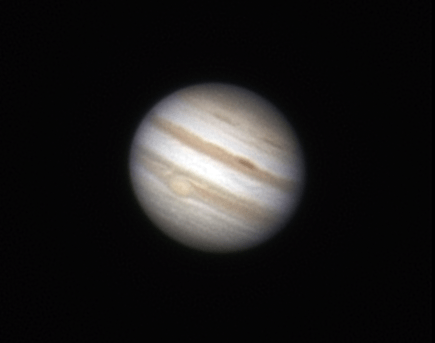 Occasionally you will see Jupiter's "Great Red Spot" or the shadow of one of the moons on Jupiter's surface. The Jupiter system is always changing.