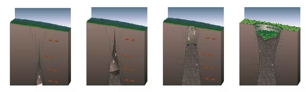 The hole in the featured image could be only a pit or shaft and not an entrance to a cave or lava tube. They're found on Hawaiian volcanos, where they're called pit craters. They don't connect to long caves or lava tubes. They're the result of a collapse that happened much deeper underground.