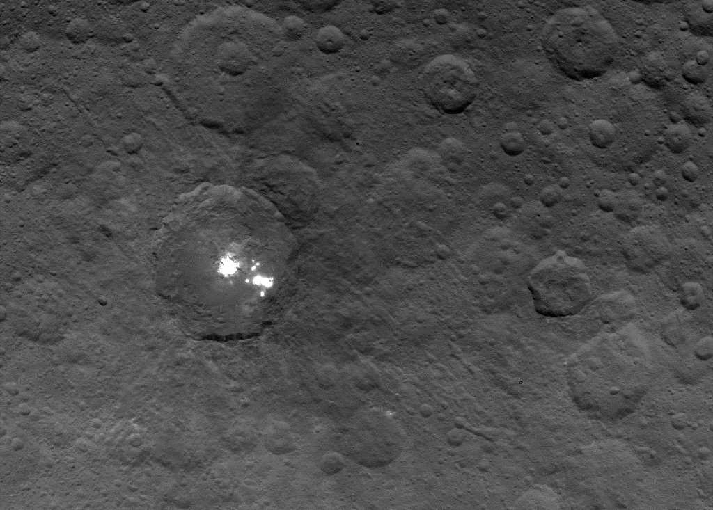 that show up when the asteroid turns into the sunlight. The team has speculated that they could be frozen pools of water ice, or patches of light-colored, salt-rich material.