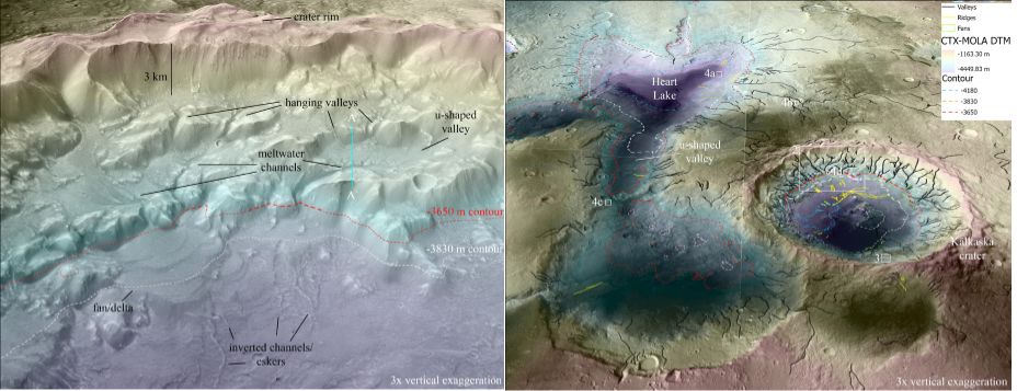 Their study focused on the region in and around a 48 km-diameter (30 mi) crater in northern Arabia Terra and the neighboring Heart Lake System. As Berman explained, this crater was previously identified as a potential paleolake, with multiple features that are indicative of wet-based sub-glacial melting: