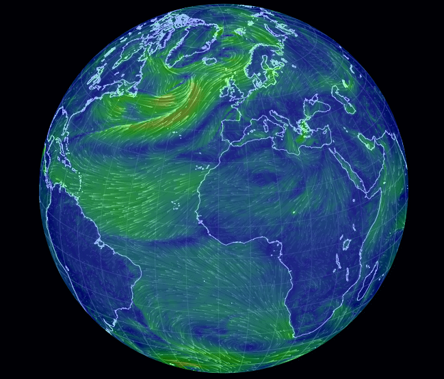 In an interactive form, this data set allows the user to move the globe around (simply drag with your mouse) and zoom in and out (use your scroll wheel). After a few seconds the colors appear in snaking lines, depicting wind patterns at varying speeds. Gentle breezes are thin lines of green, strong winds are light streaks of yellow, and the strongest current are thick lines of red and purple.