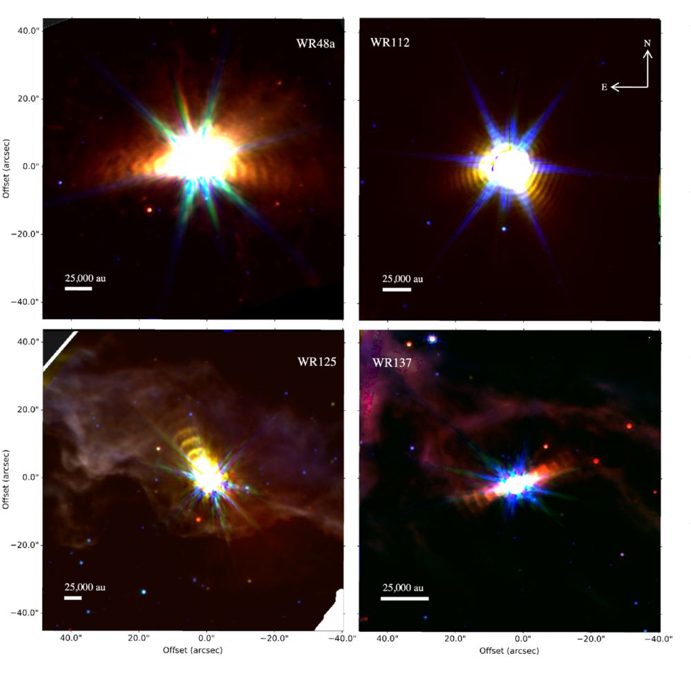 *The four Wolf-Rayet stars in the sample. "In all cases, we see large, extended structures around the stars that can be described as repeated dust structures that are similar to those observed with JWST around WR 140," the authors write. Image Credit: Richardson et al. 2025. ApJ*