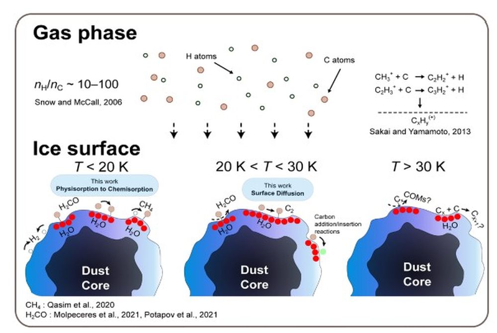 *This figure from separate research published in 2023 shows how complex organic molecules (COMs) are believed to be produced on the surfaces of icy carbon dust grains at low temperatures. Image Credit: Tsuge et al. 2023. NatAstr*