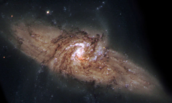 Sharp eyes, everyone. This Hubble image from 2000 was taken when the Wide Field Planetary Camera 2 (WFPC2) was brand-spanking new. It shows the unique galaxy pair called NGC 3314. Through an extraordinary chance alignment, a face-on spiral galaxy lies precisely in front of another larger spiral. This line-up provides us with the rare chance to visualize dark material within the front galaxy, seen only because it is silhouetted against the object behind it.