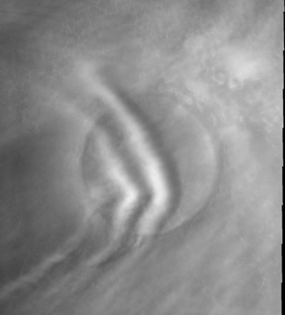 This is an image of springtime clouds over a crater on Mars, taken by the Mars Odyssey Themis (Thermal Emission Imaging System).