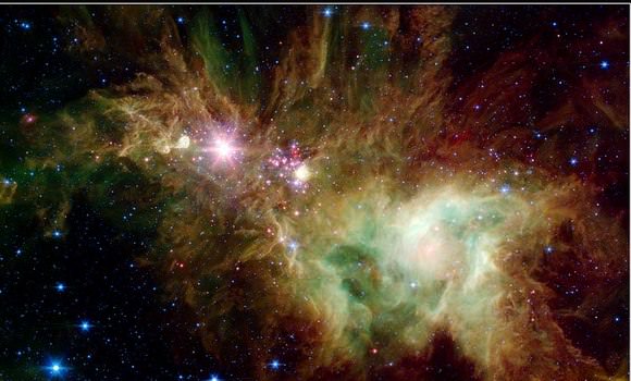 In this holiday edition of Where In The Universe, newborn stars, hidden behind thick dust in visible light, are revealed in infrared in this image of a part of the Christmas Tree Cluster from NASA's Spitzer Space Telescope. Two instruments created this image, Spitzer's Infrared Array Camera (IRAC) and Multiband Imaging Photometer (MIPS) instruments.