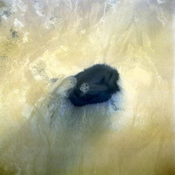 This is Waw An Namus, (or also called Uau En Namus) which is a volcano in south-central Libya. It was photographed from the Space Shuttle on mission STS-52. I love the description of this landform on the referring webpage from Oregon State: