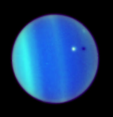 [/caption] This image from the Hubble Space Telescope is a never-before-seen astronomical alignment of a moon traversing the face of Uranus, and its accompanying shadow. The white dot near the center of Uranus' blue-green disk is the icy moon Ariel. The 700-mile-diameter satellite is casting a shadow onto the cloud tops of Uranus. To an observer on Uranus, this would appear as a solar eclipse, where the moon briefly blocks out the Sun as its shadow races across Uranus's cloud tops.