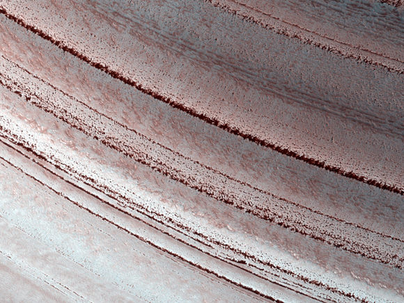 Answers were split down the middle, but the winners are those who said Mars. Yes, this is an image of icy layers at Mars' north pole, taken by the HiRISE camera on the Mars Reconnaissance Orbiter. The HiRISE folks say that the Martian north polar layered deposits are an ice sheet much like the Greenland ice sheet on the Earth. Just as with the ice sheet in Greenland, this Martian ice sheet contains many layers that record variations in the Martian climate. So this is a very interesting image -- and place -- to study.
