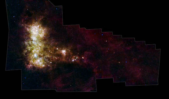 This dusty little galaxy is the Small Magellanic Cloud, as seen in infrared, taken by the Spitzer Space Telescope. In this image you can see stars and dust that haven't been visible before Spitzer's infrared eyes took a glance. The Small Magellanic Cloud is a nearby satellite galaxy to our Milky Way galaxy, approximately 200,000 light-years away.
