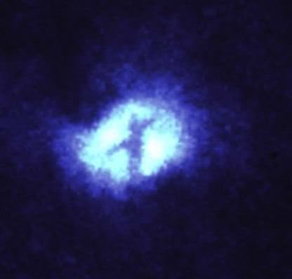 No photoshopping here, there really is a dark "X"-shape silhoutted against the nucleus of this galaxy, M51. Taken by the Hubble Space Telescope, the "X" is due to absorption by dust and this X really does mark the spot. It marks the exact position of a black hole which may have a mass equivalent to one-million stars like the sun.